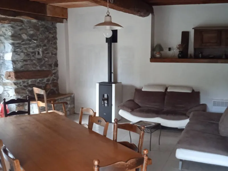 Un séjour de 35 m2 avec coin cheminée, cuisine équipée mise à disposition gracieusement avec machine à café, lave-vaisselle, frigo, four et plaque de cuisson.