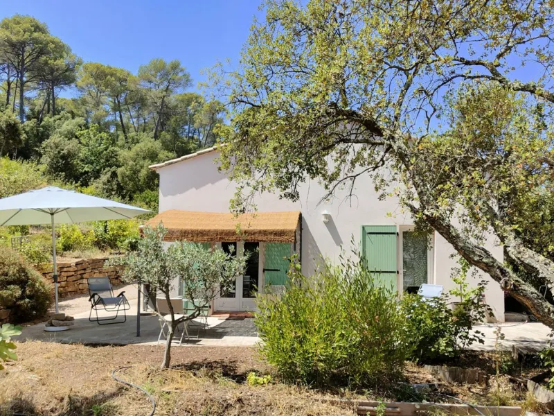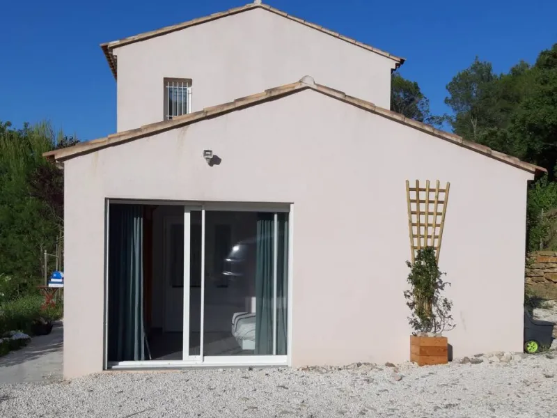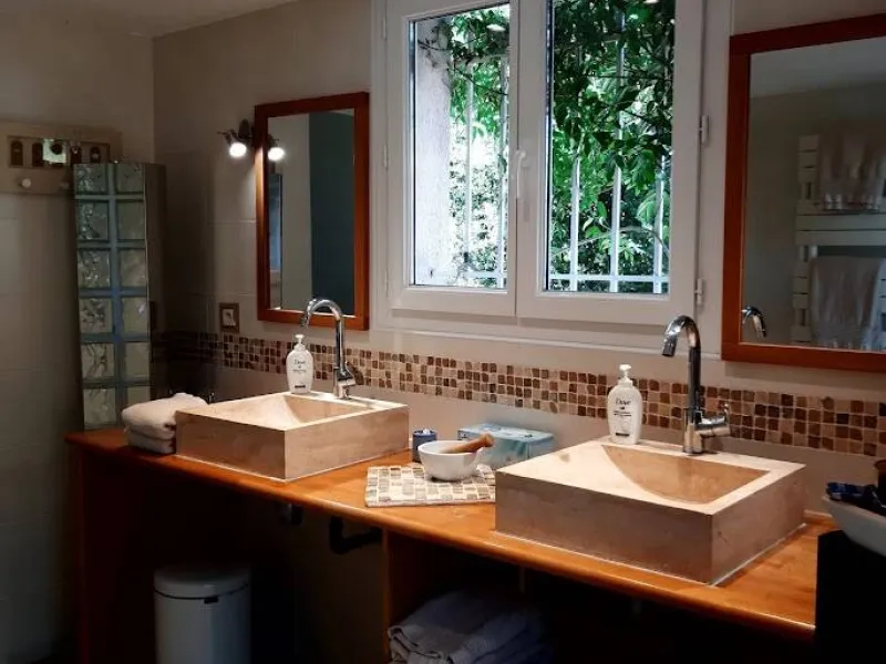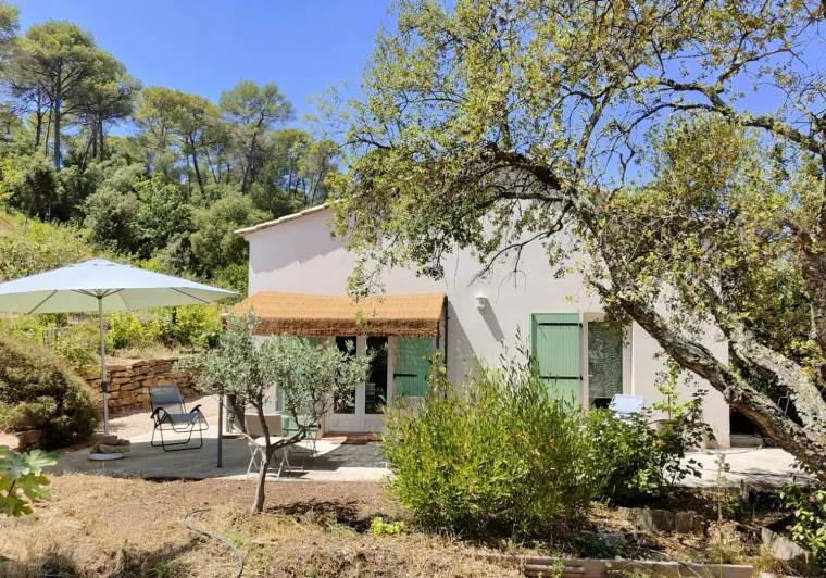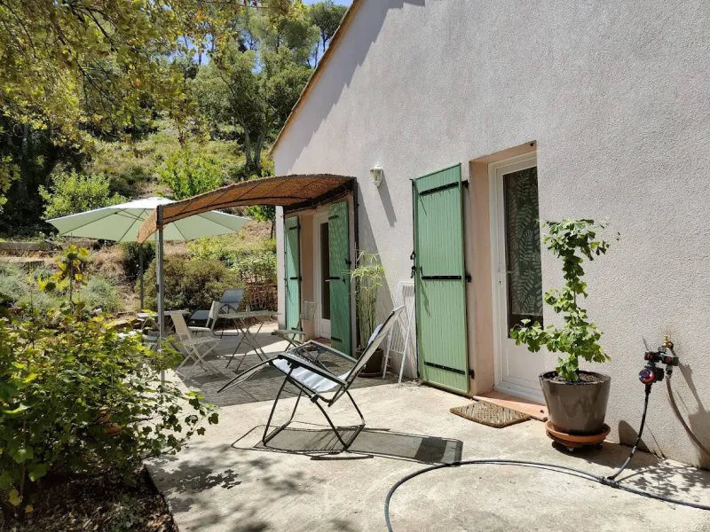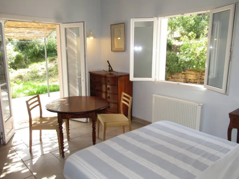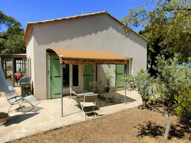 Two bedrooms with separate entrances and on-site parking:- a large, bright bedroom with cathedral ceilings, featuring a terrace with pergola and garden furniture, in a peaceful setting with panoramic views of the Maures massif. It has a shower room with walk-in shower and two washbasins.
