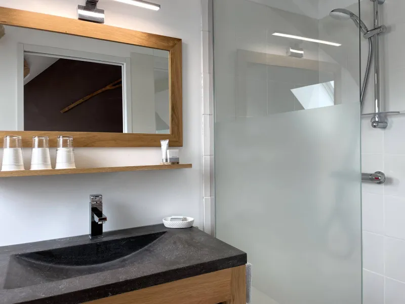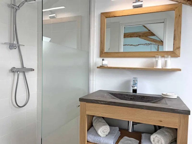 On the first floor of the barn completely renovated, we offer 3 guest rooms with refined and original decoration. The room Iceland for 2 people (1 bed 140), the family room Ocean for 3 people (1 bed 140 and a bed 90) and the room Countryside for 3/4 people, (1 bed 160 and 2 beds 90 in alcoves).