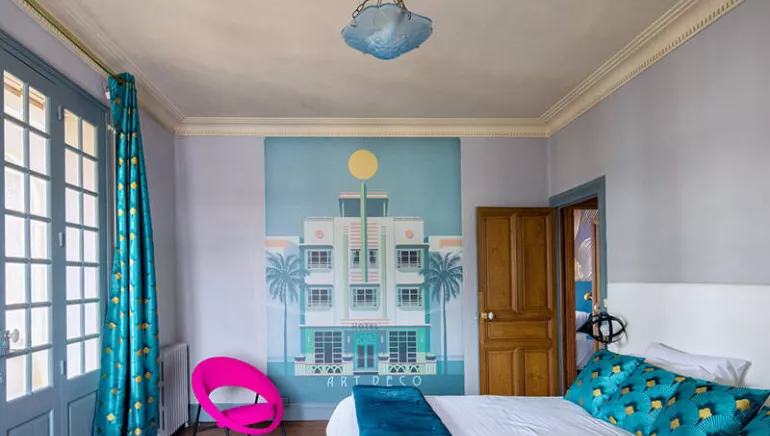 Discover an atypical house, whose Art Deco style is sure to surprise you. Enjoy a large bedroom with refined decor and meet the owners, who are friendly and keen to make your stay as pleasant as possible.