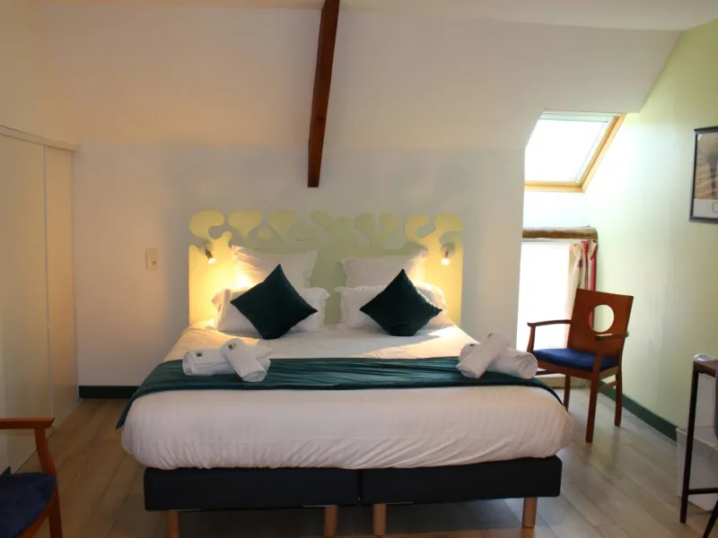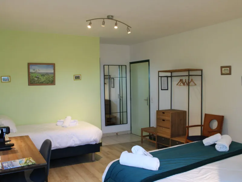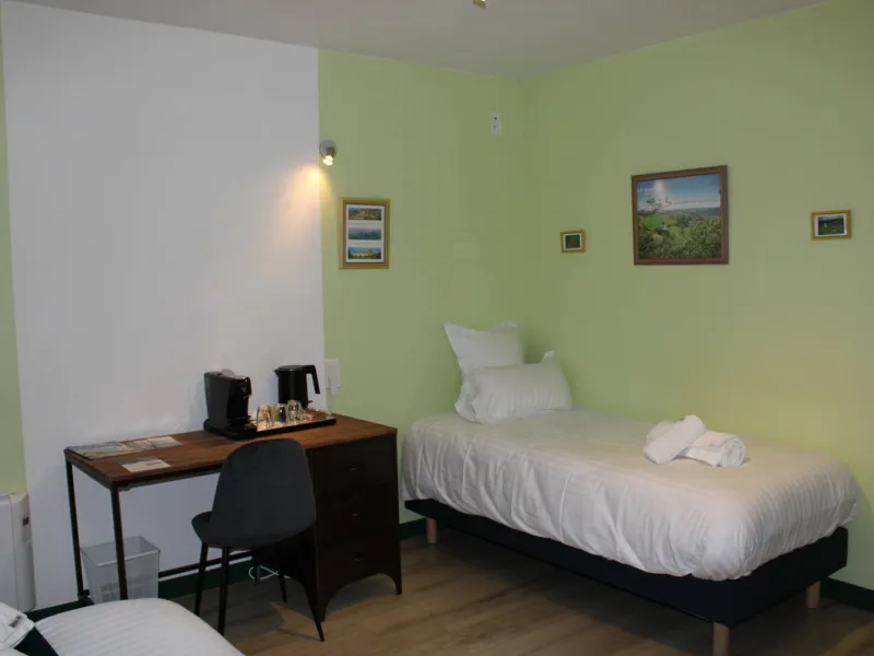 The guest room "Le Bocage" is located on the first floor. It is suitable for 4 people maximum (1 bed 140 and 2 beds 90). A shower room with WC is adjacent. There is no TV. Pets are not accepted.