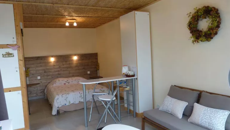 The bed and breakfast "Le Nid" is located upstairs with access by an outside staircase. Small terrace. The two guest rooms have a relaxation area with sofa, TV, kettle, tea and coffee as well as small seasonal house specialties (jams, pastries). Wifi on request, free. Sleeping area with a double bed (140). Shower room/WC (hair-dryer).
