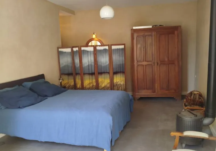 The layout is rather unique: you have a bright, double-height living room with a table, TV, a sofa bed offering comfortable sleeping for two (140x200 cm), and some basic kitchen equipment if you prefer to prepare your meals (small refrigerator, microwave, kettle, and dishes). A beautiful wooden staircase leads to the bathroom with a heated towel rail, bidet, and toilet, as well as the mezzanine under the eaves (note the low ceiling) which accommodates a double bed (140x190 cm mattress).