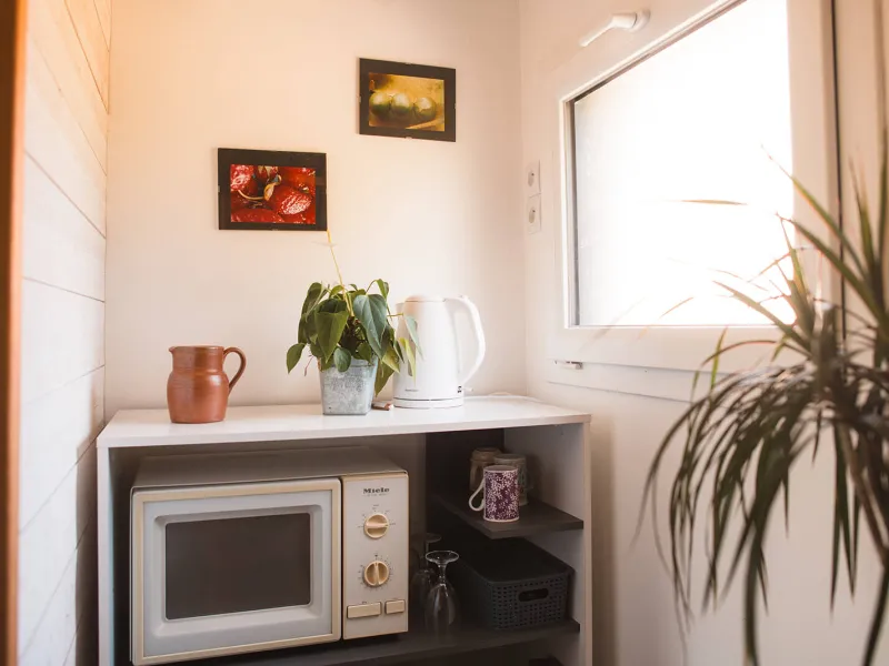 - a living room with a small kitchen area (kettle, microwave, crockery, fridge, no hob)