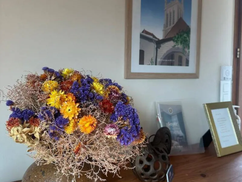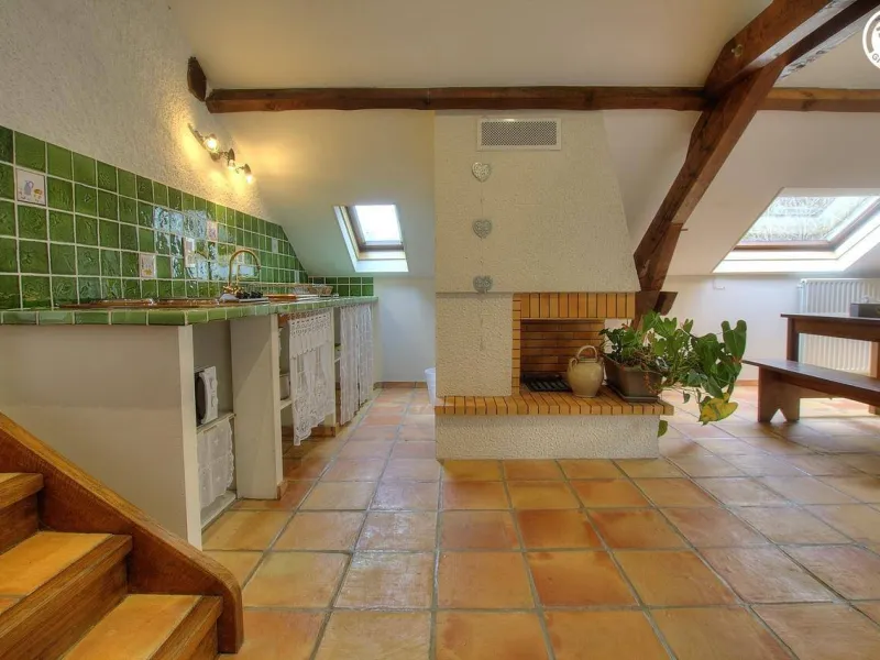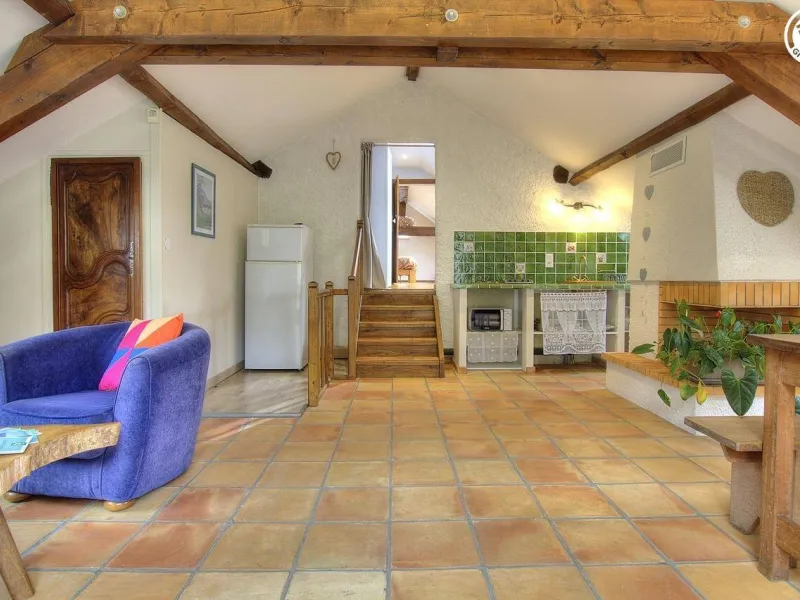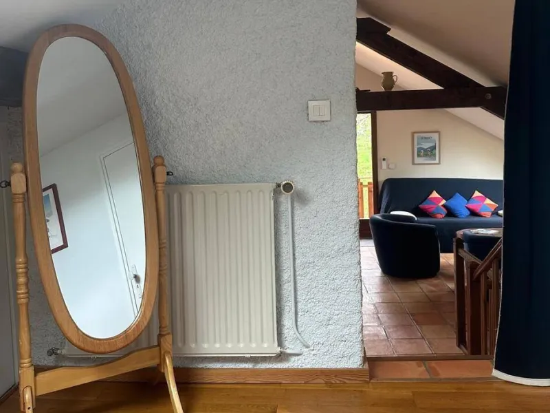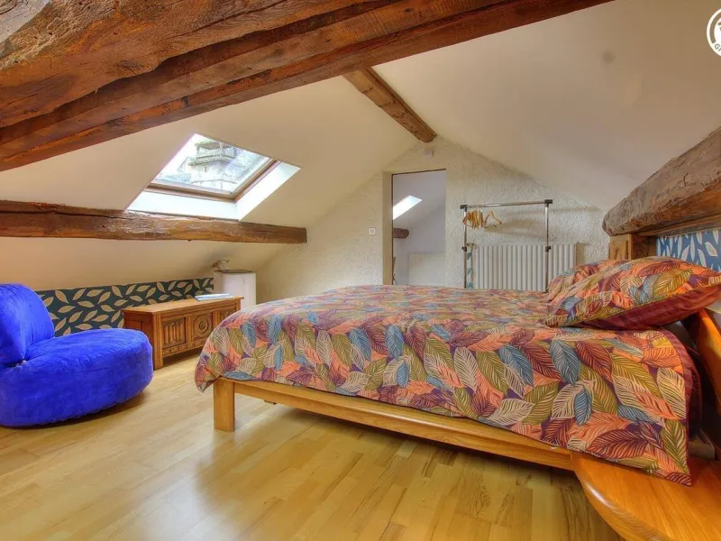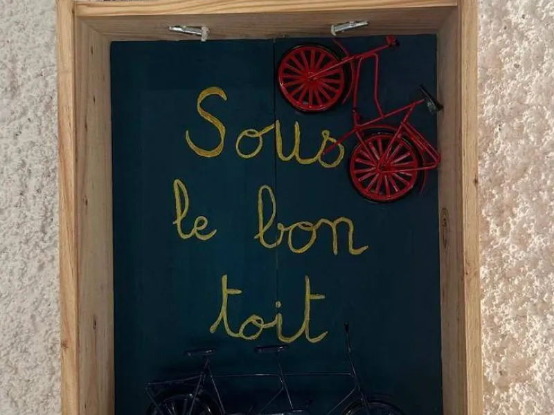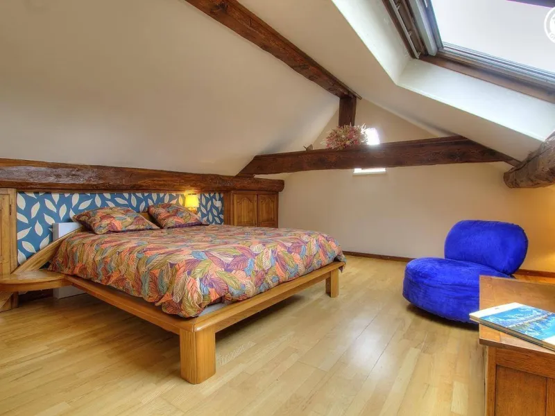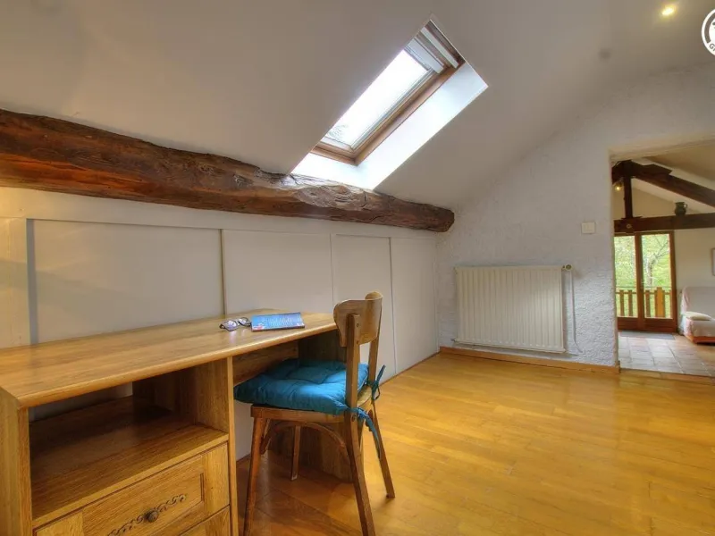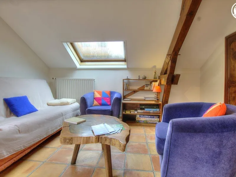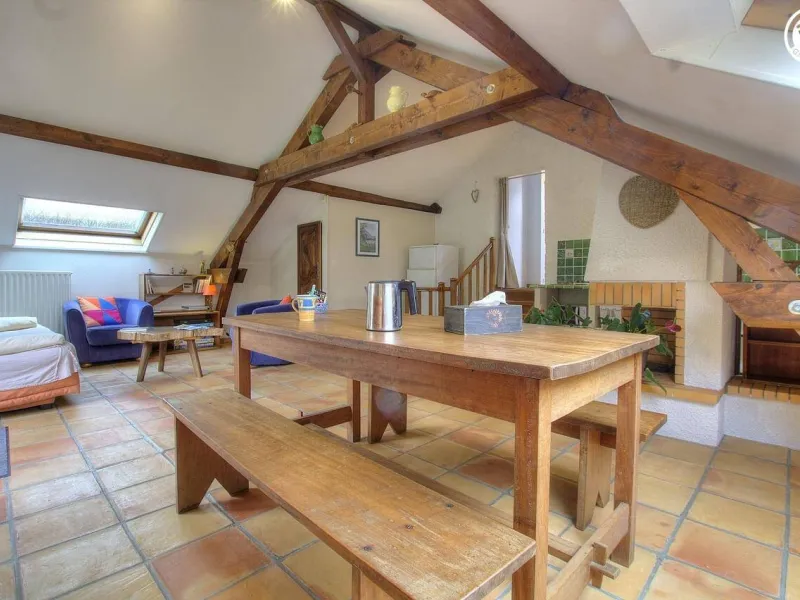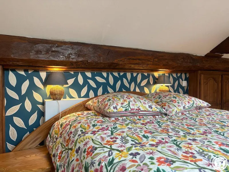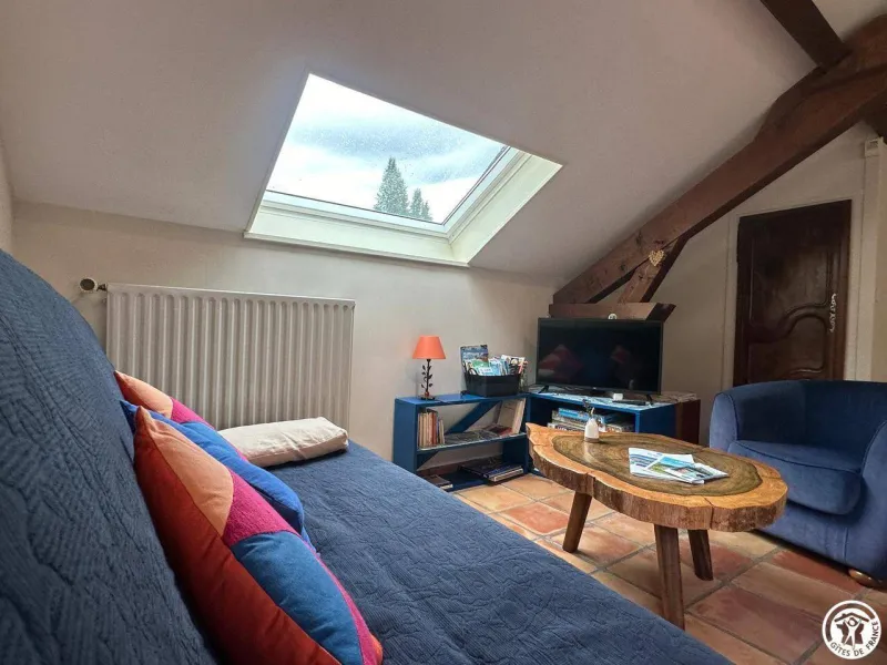 The Brillat-Savarin interview weekend will allow you to discover a large market for local products. For one night or a longer stay, Monique and Daniel are happy to open the room Under the Good Roof to you. A large bedroom under the eaves with a 160*200 bed, a living room with a 140*190 sofa. You have a living room with its ornamental fireplace and kitchen area to extend your getaway. For professionals or not, an office space.