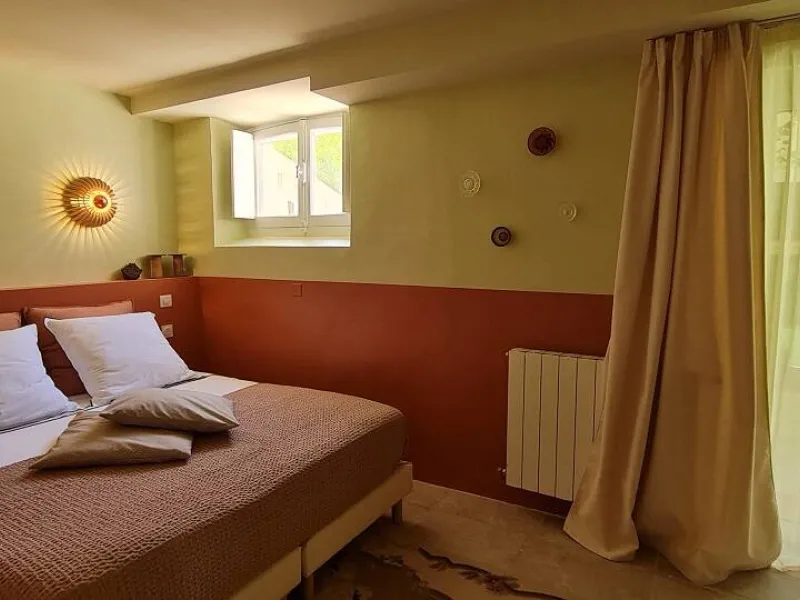 Chambre Garance, double suite, Queen-size bed, garden view, small shaded terrace with table and chairs.