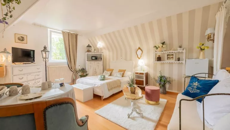 Nestled in the heart of Sedan, a charming town with a wealth of historical treasures, lies a bed & breakfast that invites you to indulge in softness and serenity: La Villa Notre Dame - Un été en Provence. As soon as you cross the threshold, you're greeted by a shabby chic ambience that envelops the premises in a warm, soothing atmosphere.The carefully thought-out decor combines vintage and modern with remarkable ease. Pastel-toned walls adorned with delicate antique moldings create an idyllic setting. The furniture, found here and there, features a subtle blend of weathered wood and delicately patterned floral fabrics. Each room has its own charm, from the wardrobes with aged wood doors to the linen-covered chairs, all evoking a nostalgic elegance.The bedroom, spacious and luminous, offers a breathtaking view of the flower-filled garden where roses and hydrangeas dance in the breeze. Large windows, draped in light curtains, let in natural light, illuminating the bed draped in soft cushions and a cozy comforter. A reading corner invites you to immerse yourself in a good book while listening to the surrounding nature.modern facilities, while respecting the retro spirit, bring undeniable comfort. Breakfast is a veritable feast, served in your room or, depending on the season, on the terrace. La Villa Notre Dame - Un été en Provence is the ideal place to escape, recharge your batteries and savor the passing of time, in a setting where every detail tells a story. Whether you're looking for a romantic getaway, an adventure with friends, or a moment of peace on your own, this bed and breakfast promises an unforgettable experience, imbued with gentleness and authenticity.