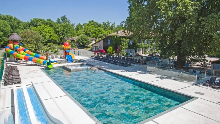 Organised activities in summer: superb aquatic area with large heated swimming pool (22x9m) including a spa area and bubble beds, a two-lane slide, a paddling pool (10x5m) with water games, fishing, tennis, volleyball, games room (coffee games, billiards, table football. .), 2 children's play areas, floodlit bowling green, basketball, football, outdoor fitness area, car, bicycle and pedal go-kart hire, library, farmyard, donkey rides, games library,