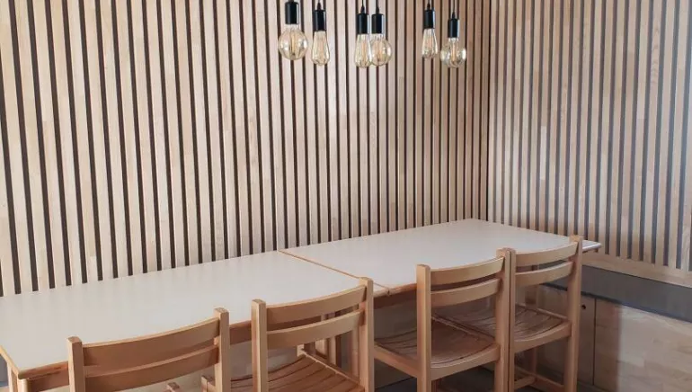 - 1 pièce principale salle à manger avec 1 cuisine équipée, une grande table et coin salon.