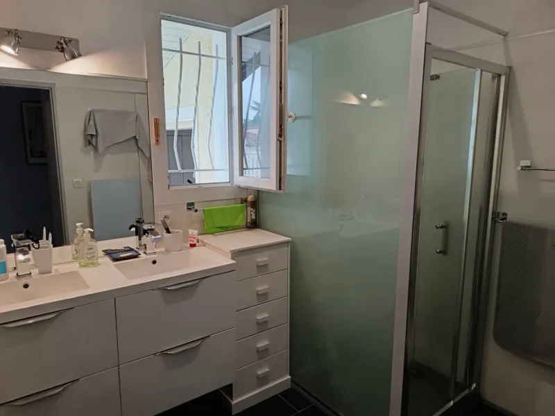 A bathroom with double sinks and shower.