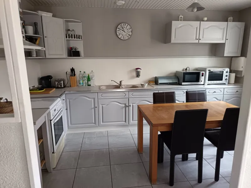 A fully-equipped kitchen for preparing and eating meals.