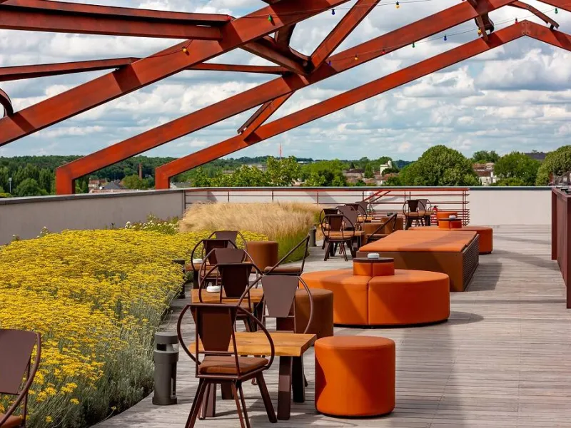 Stemming from the impressive industrial heritage of Jean-Gabriel Monnet's former wine cellars, built in the 19th century, the Hôtel Chais Monnet & Spa embodies a new way of experiencing luxury in Cognac. Nestled between the charm of the town and the gentle vineyards, this five-star establishment stands out for its unusual architecture, a bold fusion of historic structures and contemporary design.The hotel offers 92 rooms and suites, the Michelin-starred restaurant Les Foudres, the contemporary brasserie La Distillerie, Bar 1838 and its rooftop terrace, the Monnet art gallery, as well as a spa and wellness area, fitness room, hammam, sauna, jacuzzi, and indoor and outdoor swimming pools.