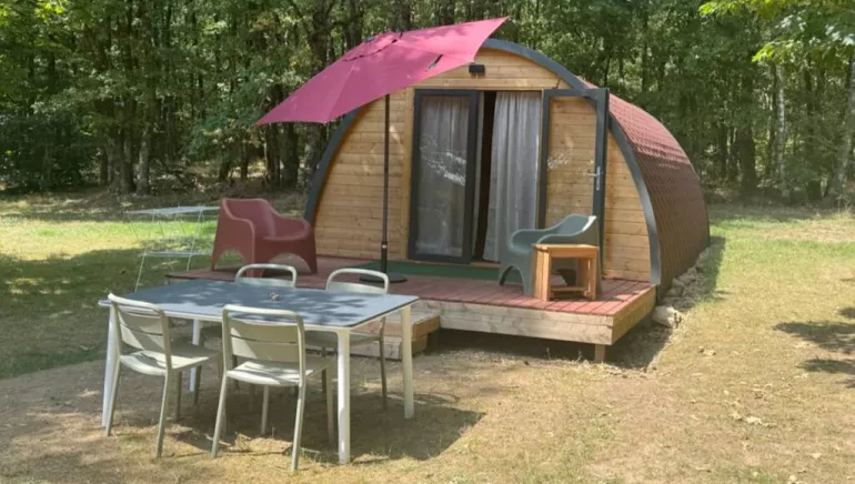 Our nesting boxes (pods) on the edge of the forest, named after some of the birds present at Domaine de Lallé, are fully equipped and set up for a maximum of 4 people. In Le Milan Rouge, with its terrace and view over the campsite, you'll find a double bed and a single bed in the bedroom, and a small sofa-bed in the living room. The kitchen is equipped with a two-burner hob, a fridge and, of course, a coffee machine (Nespresso) and kettle. A toilet is also available; for the shower, you'll use our brand-new toilet block. It is possible to add an extra tent next to all the accommodation. Ask about the possibilities.