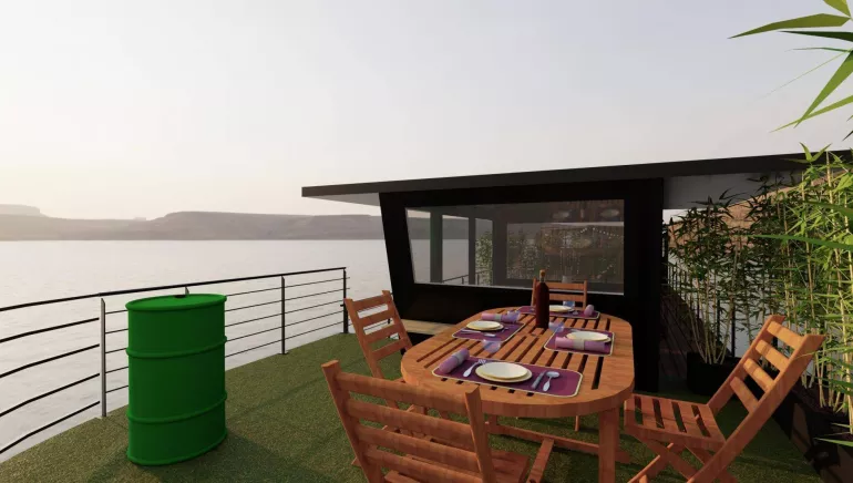 Accédez depuis la passerelle à un espace cuisine et une grande terrasse de 30 m², couverte, offrant une vue panoramique sur le Rhône et l'Ardèche. En descendant quelques marches, vous trouverez un coin nuit avec un lit en 160x200, un coin détente avec canapé, et une salle d'eau avec douche et WC. LIVRAISON EN JUIN - RÉSERVATION À PARTIR DU 15 JUIN 2025 - PHOTOS CONTRACTUELLES 3D