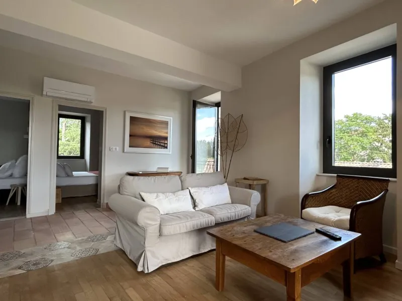The gîte also has a large private terrace of over 17 m2 with an uninterrupted view over the wooded grounds of the Clos.