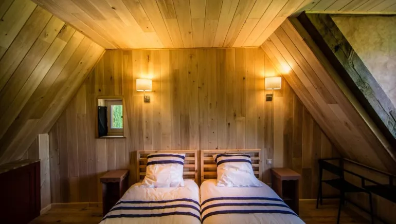 The eco-gîte nestled in the 4 ha park of the Domaine du Colombier is equipped for 6 people with 3 bedrooms (1X2pers, 4X1pers) including one accessible PMR room.