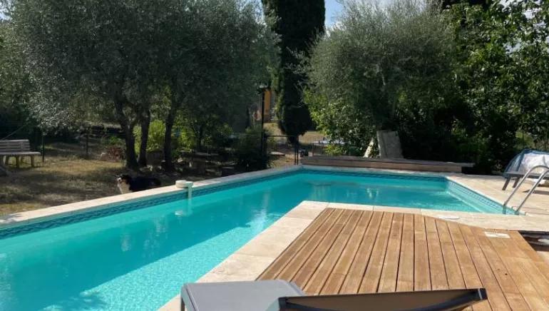 One bedroom with a 160×200 bed, bathroom, lounge area with a bench that converts into two 90×190 trundle beds, fully equipped kitchen, terrace, reversible air conditioning, sun loungers, and a saltwater pool. Ideal for a family holiday or a getaway for two.