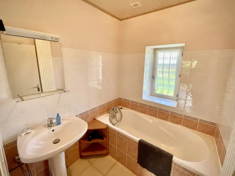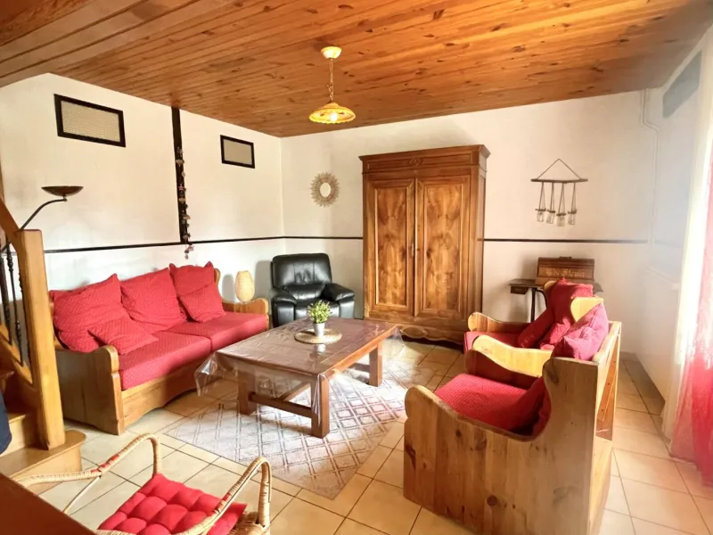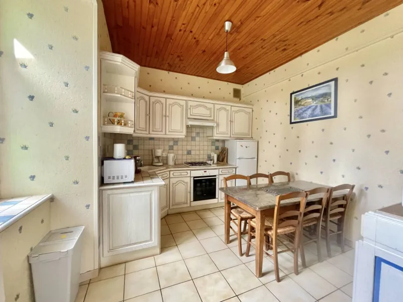 cuisine, séjour, poêle cheminée, salon en demi-niveau, 1 chambre (1 lit de 160), salle de bains (baignoire), wc indépendant.