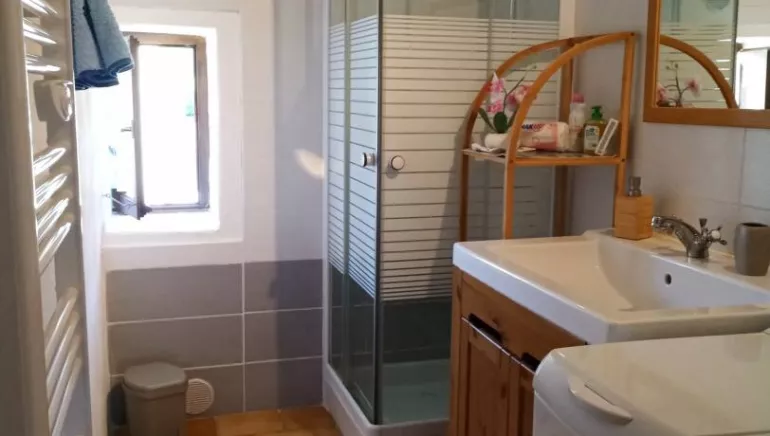 Gite entièrement équipé avec lave vaisselle et lave linge, frigo, congélateur, un coin cuisine, un grand séjour, coin salon avec canapé, 1 chambre lit double, 1 chambre (2 lits simples), WC indépendants, salle d’eau (cabine de douche).