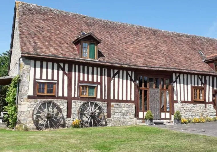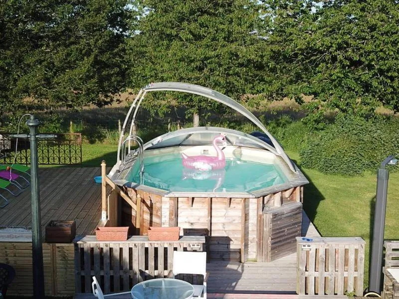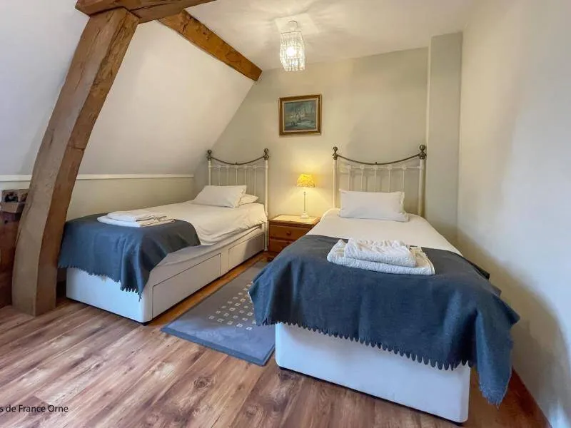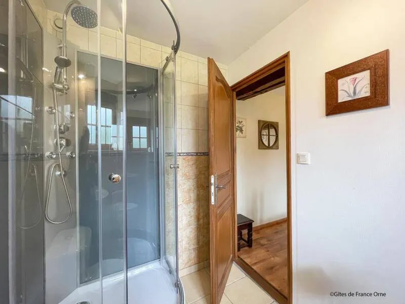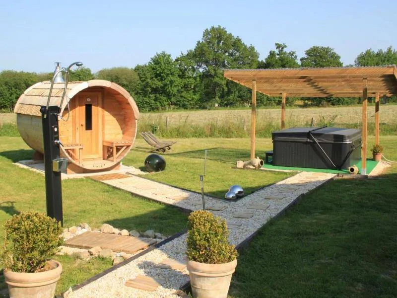 The impressive structure of this old press is beautifully highlighted. You will benefit from the comfort of this big cottage very close to the green way and the small city of character of Domfront.Old independent press near the owners. The swimming pool, jacuzzi, sauna and the garden are private for gests. Ground floor: living room (pellet insert, games console) with dining room, kitchen, bedroom (1 double bed) with private shower room / wc, bedroom (1 double bed 150 cm) with bathroom / Wc (bath and shower). Upstairs: bedroom (2 single beds) and bedroom (2 single beds) with shower room / wc. Floor by second staircase: landing with corner living room, room (1 double bed 150 cm) with room of water / toilet private. Central heating. Possibility dryer on request. Private terrace with gable without opposite. Access 2 hours included in the sauna in a barrel and in the outdoor Jacuzzi (supplement 30 € / 2 h beyond). Above ground pool heated from April to September, pétanque court, badminton, football and hockey.