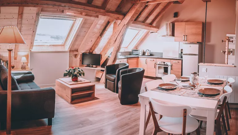 Sur le côté ensoleillé du val de Lans, à mi-chemin entre Lans-en-Vercors et Villard-de-Lans, la bâtisse comporte désormais un gîte de caractère classé 4 étoiles. D’une surface de 55m2 au sol, il peut accueillir jusqu’à 5 personnes. La charpente apparente lui donne un caractère très chaleureux. La pièce de vie de 24m2 offre une vue imprenable sur les sommets alentours. La chambre Sud dispose d’un lit 160x200cm alors que la chambre Nord dispose de 2 lits 90x200cm (superposés) et d’un couchage 90x190cm en mezzanine.