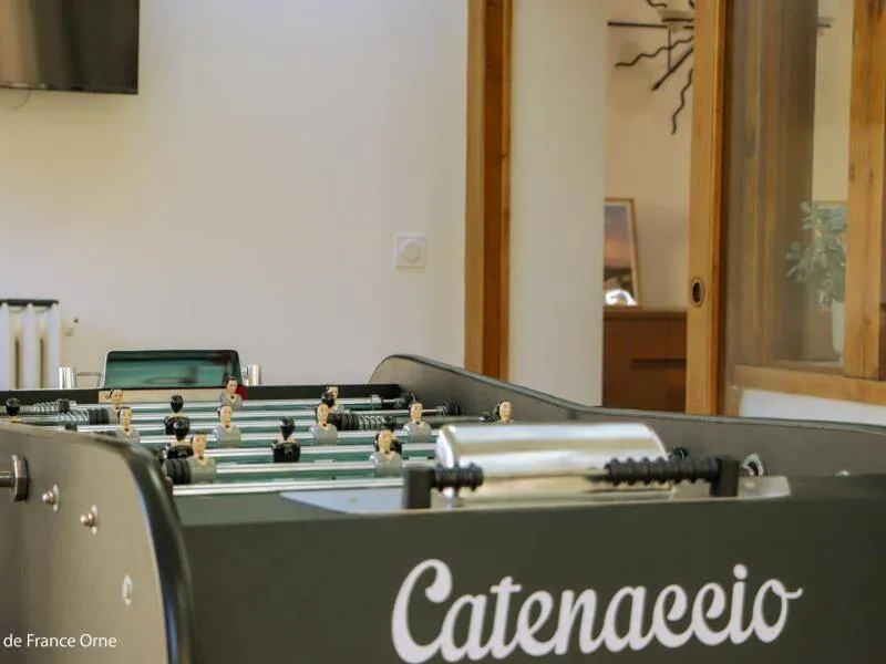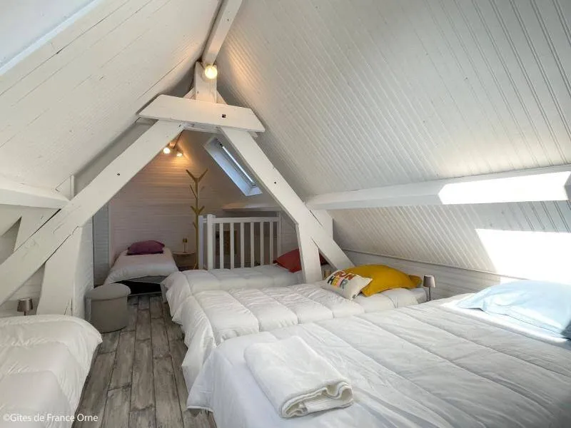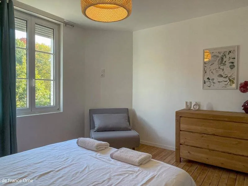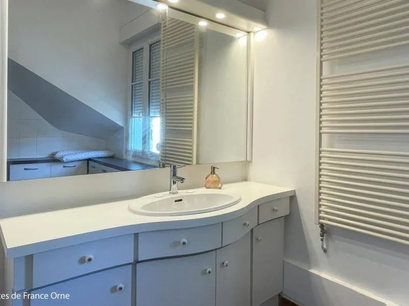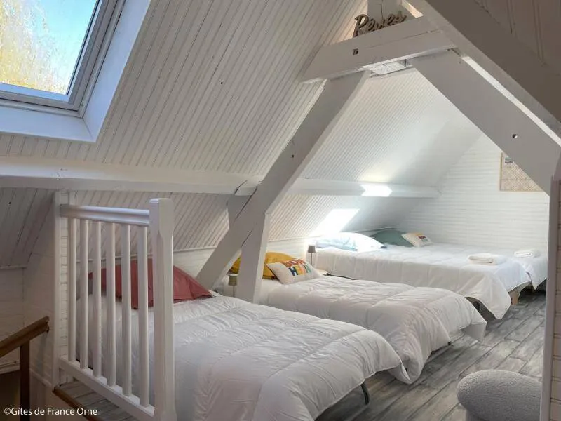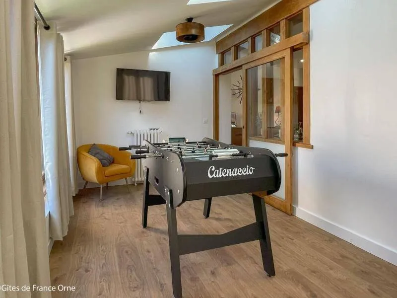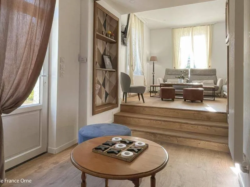 Immerse yourself in the elegance of a Belle Époque-style detached house typical of Bagnoles de l'Orne, for 10 adults + 5 children, with an enclosed garden for a peaceful retreat. Just a stone's throw from the Andaines forest, explore the hiking and cycling trails, and take advantage of Bagnoles' proximity to shops and historic districts.Detached house with enclosed grounds, a stone's throw from Bagnoles town center. Ground floor: - Fitted kitchen - Living room with dining area and two lounge areas with TV, ethanol fireplace, board games - Additional room with table soccer and TV - Laundry room (washing machine, highchair and cot) - Separate wc First floor: - 1st bedroom with bed 160x200 and extra bed (for child), and en-suite shower room (shower and washbasin) - 2nd bedroom with bed 160x200 and extra bed (for child) - 3rd bedroom with bed 160x200 and extra bed (for child) - Shower room with shower Attic dormitory on 3rd floor: 4 beds and 2 extra beds Terrace with garden furniture and barbecue Bicycle garage with charging point Deckchairs