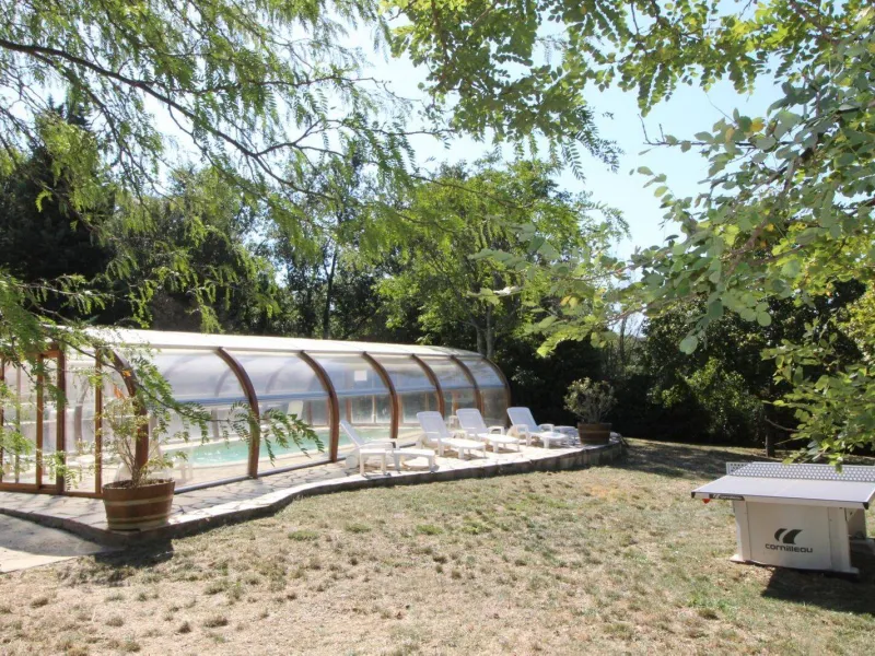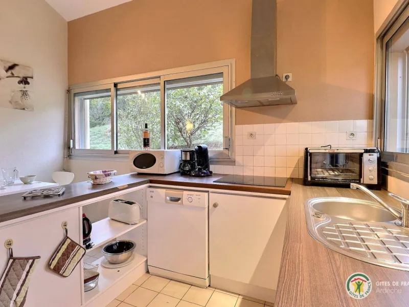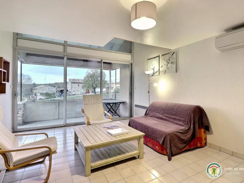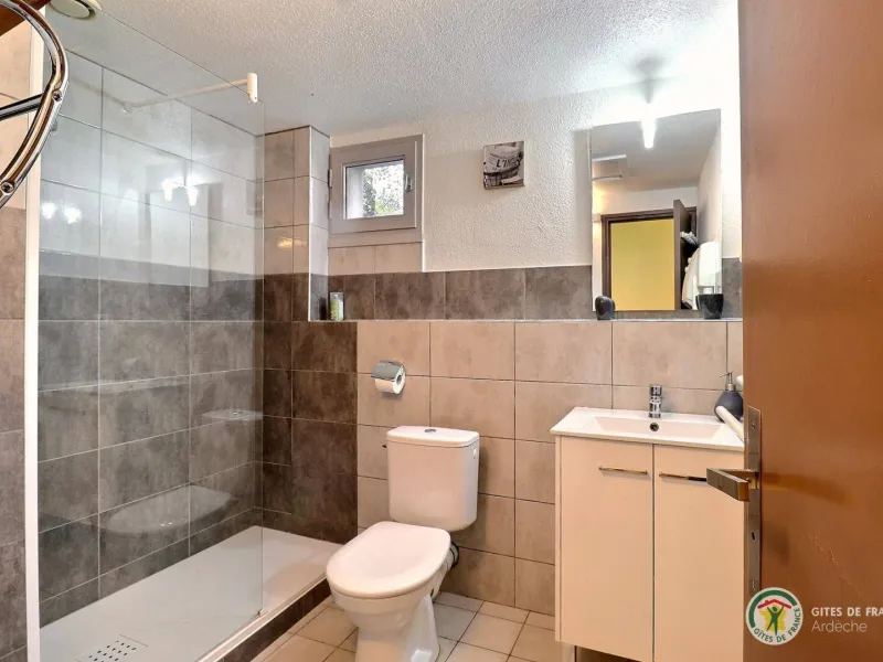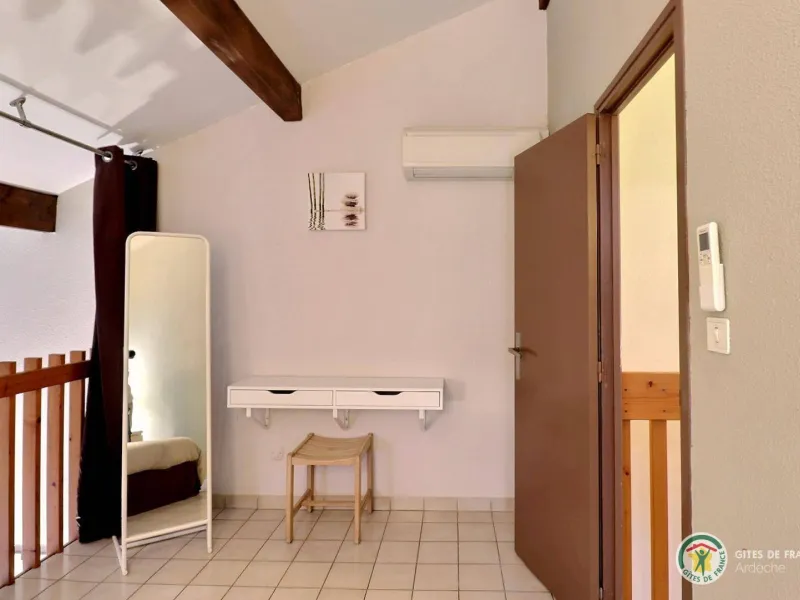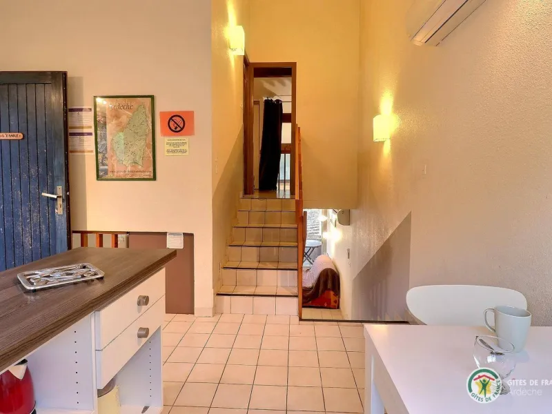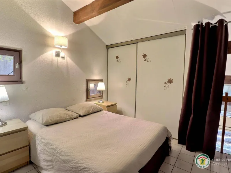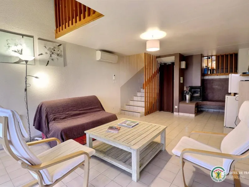 Living room (double sofa bed, wall-hung flat screen TV, inset fireplace - free firewood), kitchen, mezzanine (double bed), bathroom/WC. Cot, high chair on request. Electric heating. TV point. Terrace, balcony, shared garden. Large shops 11km. Warm/cool air system. Covered swimming pool (4x9m) shared by 5 gîtes. Gîtes are 100m from waymarked hiking trail and about 3km from GR (long distance footpath). Towel hire: 3€/week/small towel, 5€/week/large towel.Localisation