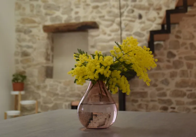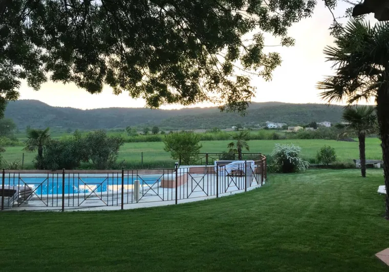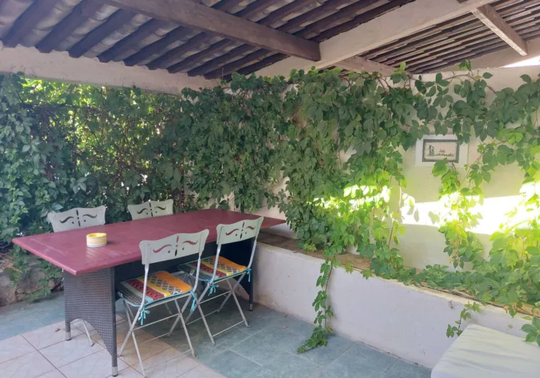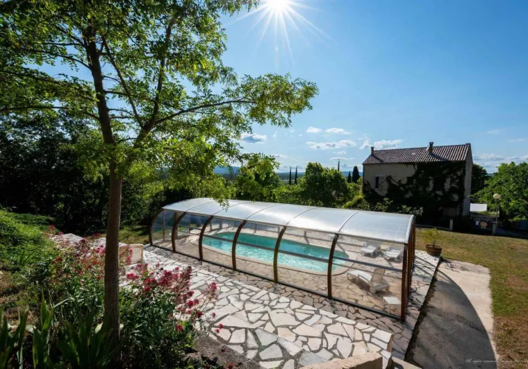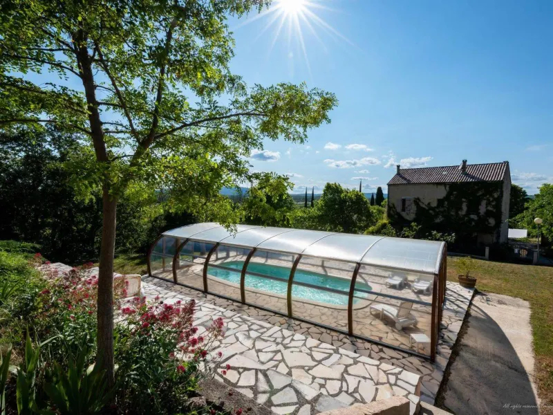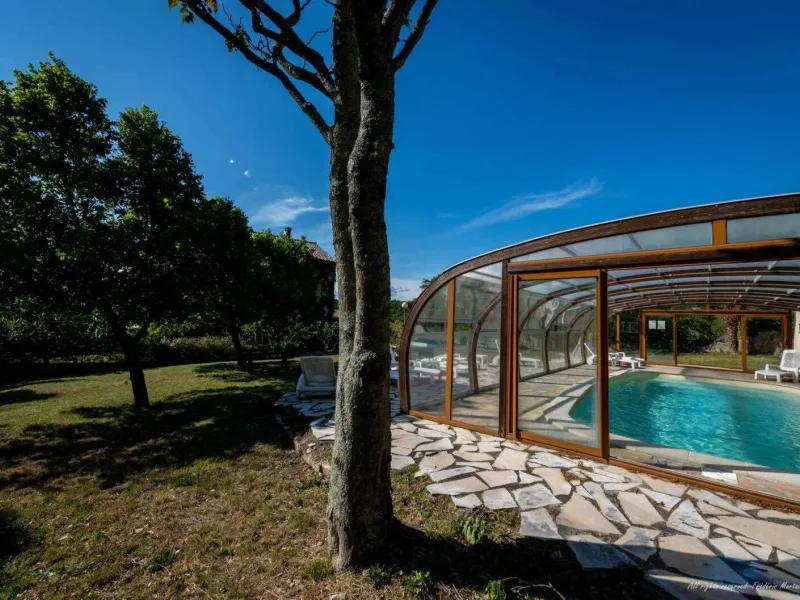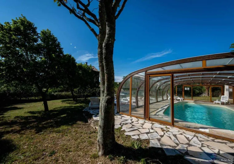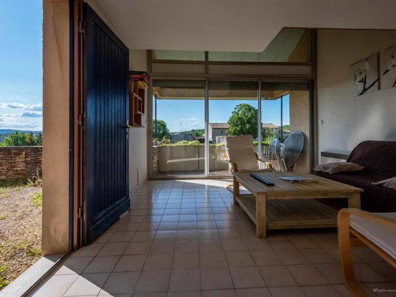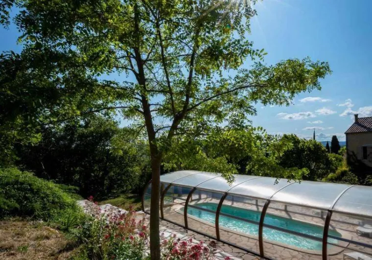 Living room (double sofa bed, wall-hung flat screen TV, inset fireplace - free firewood), kitchen, mezzanine (double bed), bathroom/WC. Cot, high chair on request. Electric heating. TV point. Terrace, balcony, shared garden. Large shops 11km. Warm/cool air system. Covered swimming pool (4x9m) shared by 5 gîtes. Gîtes are 100m from waymarked hiking trail and about 3km from GR (long distance footpath). Towel hire: 3€/week/small towel, 5€/week/large towel.Localisation