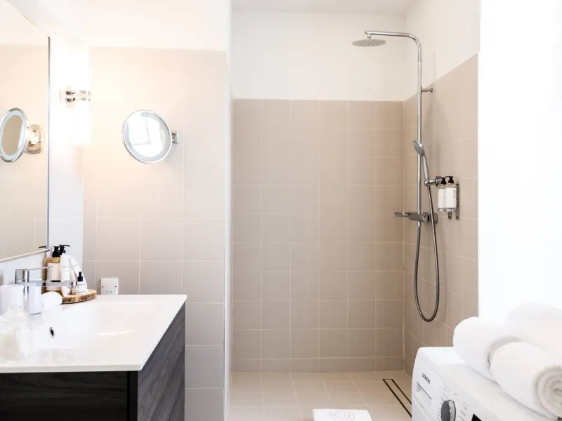Bathroom with window, rain shower and washbasin, separate WC