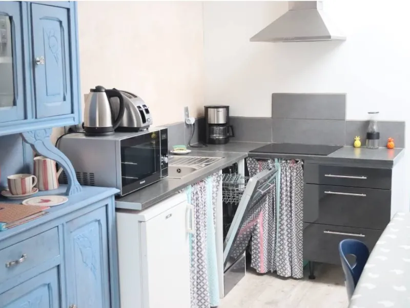 => a kitchen equipped with a grill oven, 1 microwave, an induction hob with 3 burners, etc...