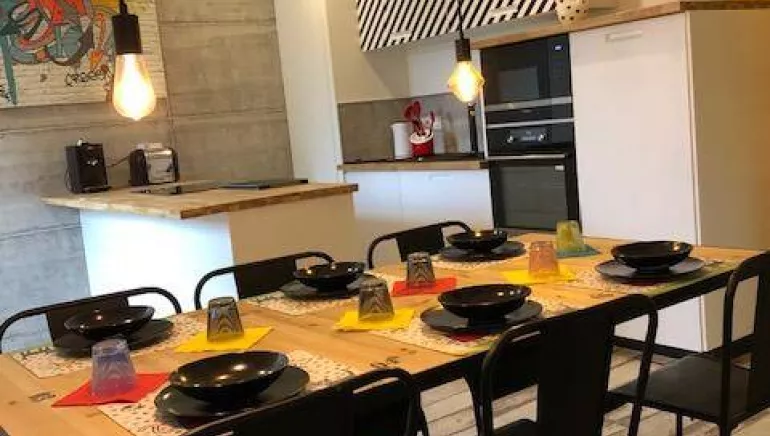‘Le Déjanté’, large duplex apartment on the 1st floor of a stone building. On the 1st floor, a bathroom-WC with bath, a fully-equipped open-plan kitchen opening onto a large living room and a dormitory bedroom with 4 single beds. Upstairs, a master bedroom with en-suite shower room and WC opens onto a large terrace offering magnificent views of the Grand Colombier and the Alps.