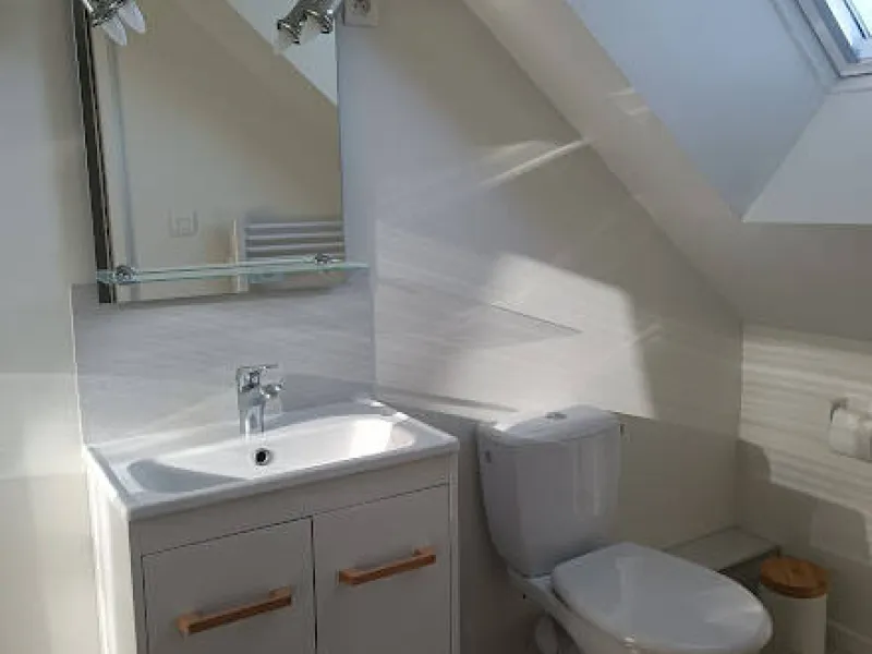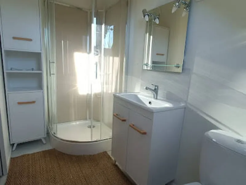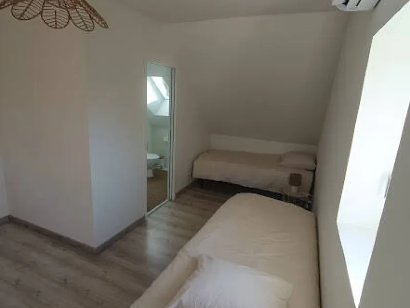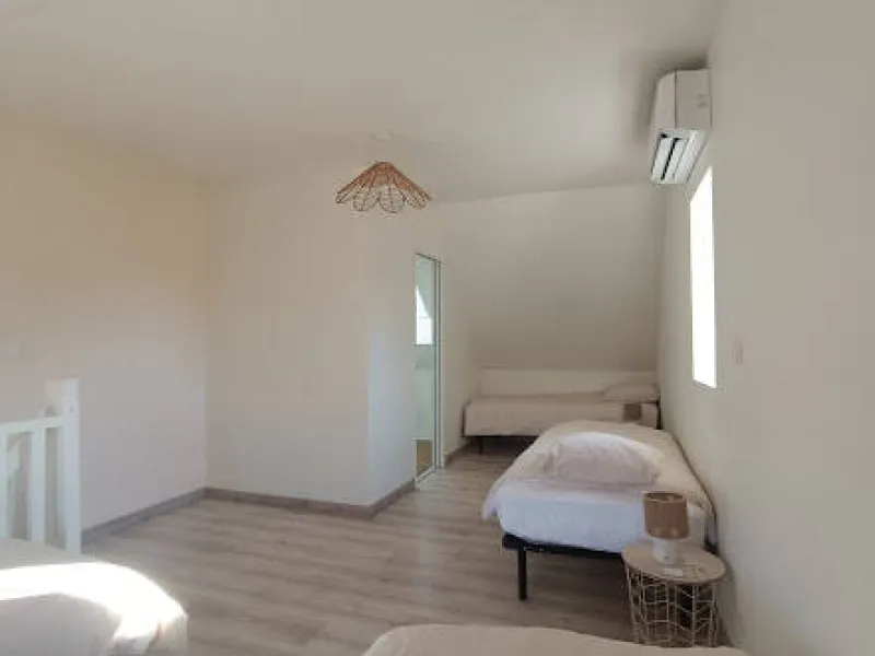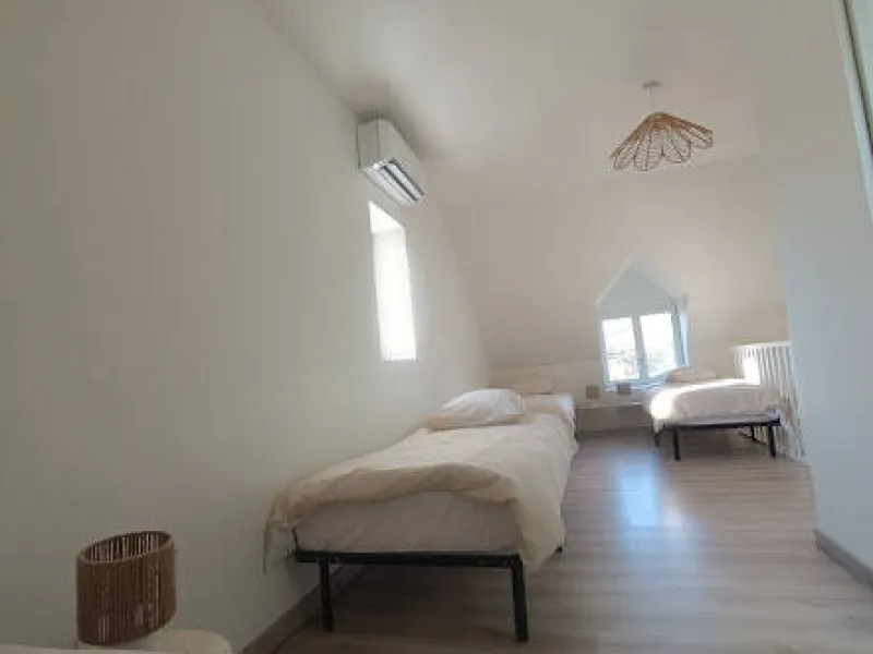 À l’étage, une grande chambre est dotée de quatre couchages en lit simple de 90. La deuxième salle de bain possède une cabine de douche de 90 x 90 et des toilettes pour plus de confort pour tout le monde.