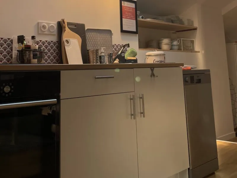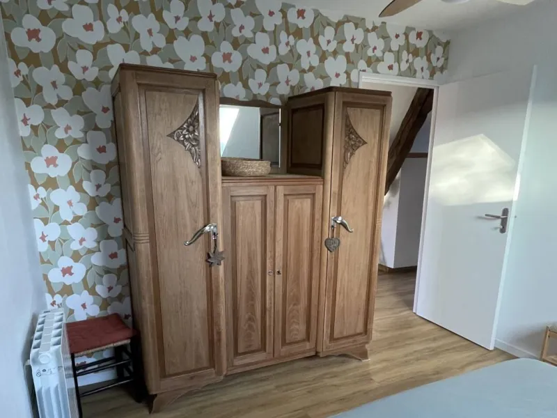 It includes a 140 x 200 cm bed (new French-made mattress and slatted base), an Art Deco wardrobe with two wooden wardrobes and hangers, and a built-in mirror.
