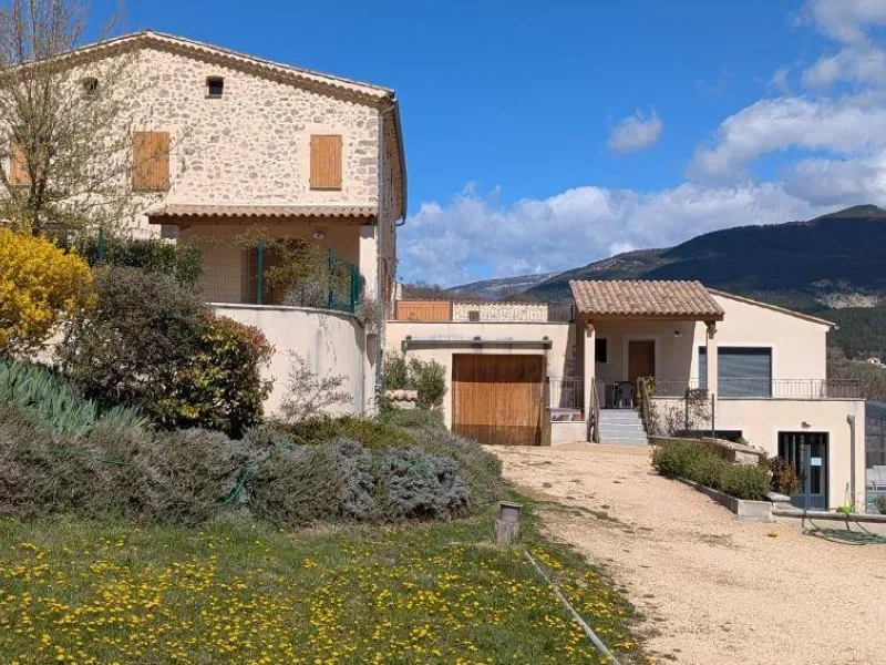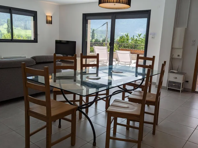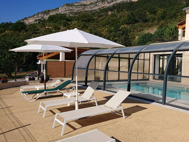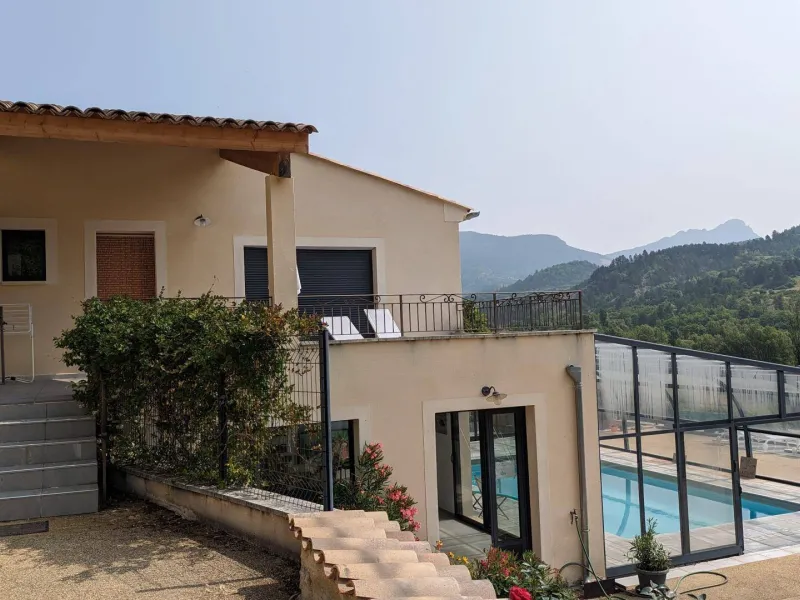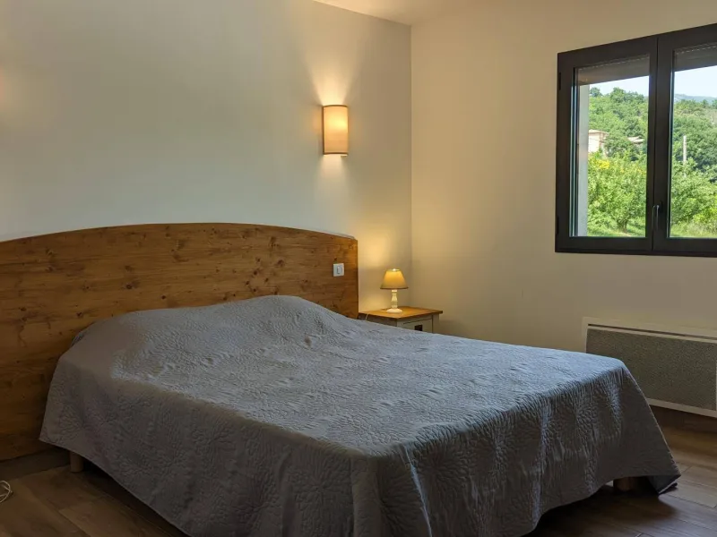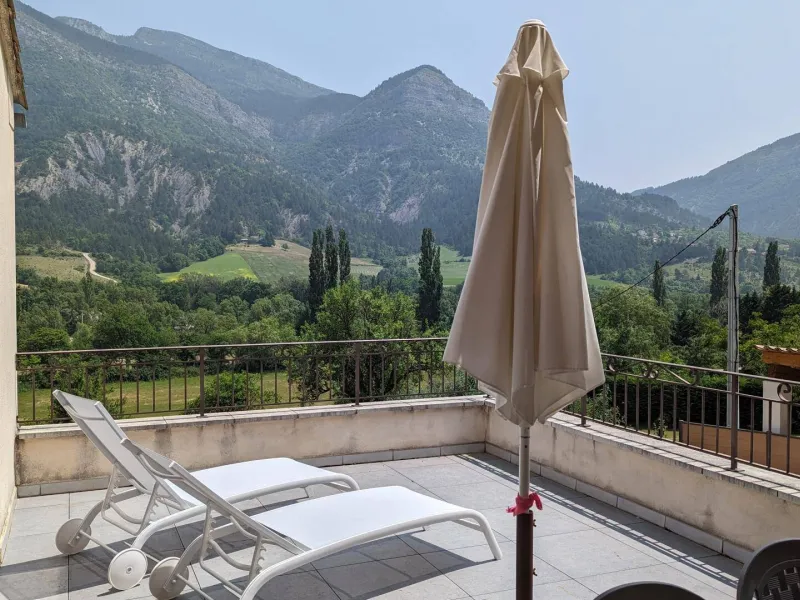 There are 5 Gîtes d'Adrien (2 to 8 people) on 19th century family farm with view of Les Aiguilles mountain, the Mont Rond and the Rocher du Caire, all ideal for walking/hiking and observing vultures and birds of prey. At end of day, relax and get together around the shared indoor swimming pool (8x4.5m, 1.30m deep), heated April to October. All the gîtes are comfortably equipped. Shops/services in village: minimarket with petrol station, chemist's, Post office, free shows. Cornillon lake (swimming, fishing) 5km. Near Rémuzat: towns of Nyons and Vaison-la-Romaine (summer markets), château of Grignan (famous as the residence of Madame de Sévigné).1st floor gîte. Kitchen/living room & lounge area, 3 bedrooms (queen-size bed in each), shower room (walk-in shower), separate WC. Partly covered terrace (20 sq.m.).