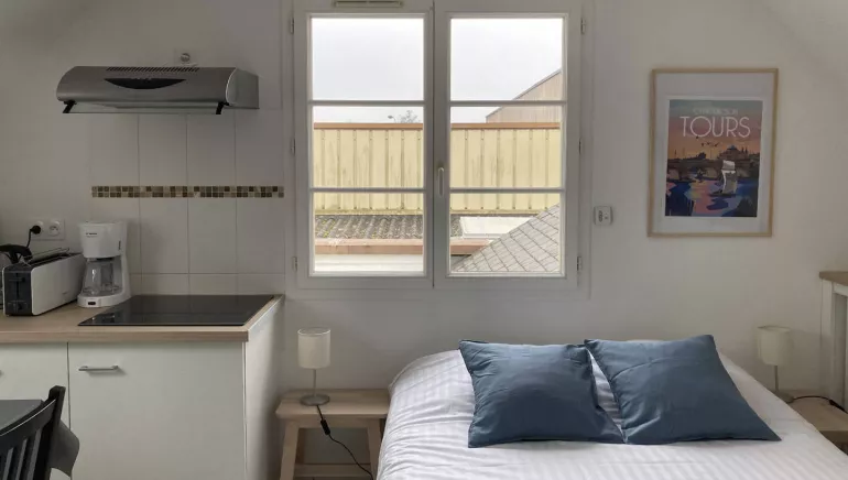 Studio of 15m² (**). On the first floor. Fully furnished. Rental for short, medium duration. This lodging is located at a few minutes with bicycle of the center of Tours. Quality services. Heating on the ground. Storage space. Fully equipped kitchen