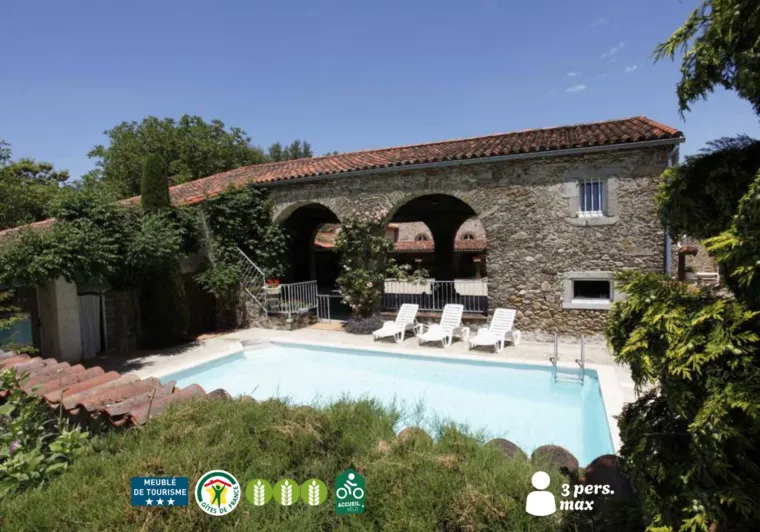 Sylvie and Serge have set up a second gîte for 4 persons, in the other wing of the farm of Rieussequel, a former traditional farm building , renovated little by little. It grants a roomy living-rm on the GR.FL, and full comfort for a discovery stay, ideally situated at the foot of the Montagne Noire (at 200 m from the green way Mazamet-Bédarieux), at 1 hour from the Languedoc beaches, from the City of Carcassonne, and at a few minutes from the Big Lakes (Lake of la Raviège, of the Montagnès…).Gîte adjoining the owner's house, in a wing of this renovated farm building. GR.FL: Roomy living-rm-cum-fully equipped kitchen. Upstairs: 2 bdrms (1 dble bd, 2 single bds), TV lounge corner on the landing, shower rm, WC. Fuel heating. Dishwash., fridge + freezer, micro-w ., electr.oven, gas 4-burners plate, washing mach. shared with another little gîte. Baby equipmt. Courtyard, car shed, garden table & chairs, BBQ, ping-pong, bikes, swimming-pool shared with another gîte + the owners. Sheets and towels supplied, cleaning service.