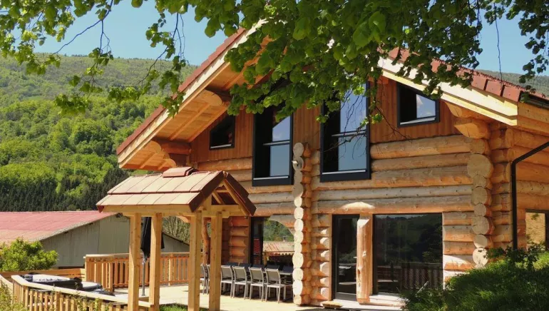 Bernard has built this magnificent log cabin at the foot of the Rencurel cliffs in Vercors park. A welcoming, wood-construction nest built in a contemporary design, large living areas opening up on to a terrace with jacuzzi. Bedroom 1 (1 double, private washroom), utility room (washing machine, drier), WC. First floor: bedroom 2 (1 double), bedroom 3 (1 double), (all the double beds can be split in to 2 singles), WC, washroom, bedroom 4 (4 singles plus private washroom). Wood-fuelled central heating, flat-screen TV, Wi-Fi, car parking, garage. Ski, snowshoe or hiking routes, cliffs for climbing in Presles, the suspended houses of Pont en Royans, les Grottes de Choranche, hiking routes, canyoning, etc.