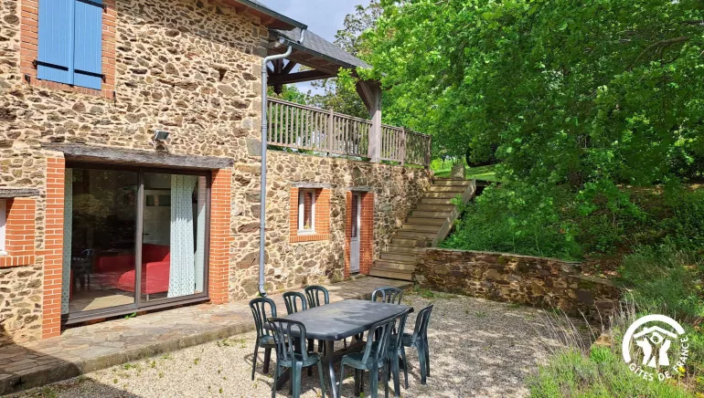 Set up on three levels. On the gr. fl. : living-rm-cum-kitchenette, bathrm with WC. On the1st fl. : lounge (sofa-bed 2 pers.), 2 bdrms (2 dble bds), shower rm, WC.. Mezz., access through 1st fl. : (1 dble bd, 2 single bds), poss. baby bd. Fuel central heating, fireplace. Micro-w., washing mach., dishwash., TV. Shaded grounds, courtyard, terrace. Price all charges included. Animals only allowed in the laundry adjoining the gîte. Indep.gîte, situated at the entrance of a hamlet, in the core of a 55 hectares nature area : fields, meadows, wood(very varies fauna & flora). Poss.angling in nearby hill lake. Games area : ping-pong, baby-foot, French billiard rm. Poss.cleaning service at the end of your stay.f your stay