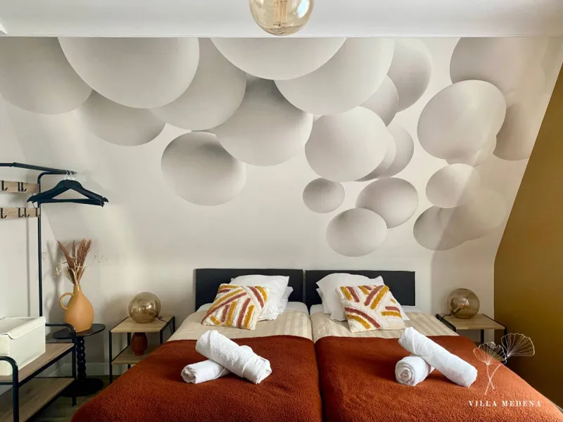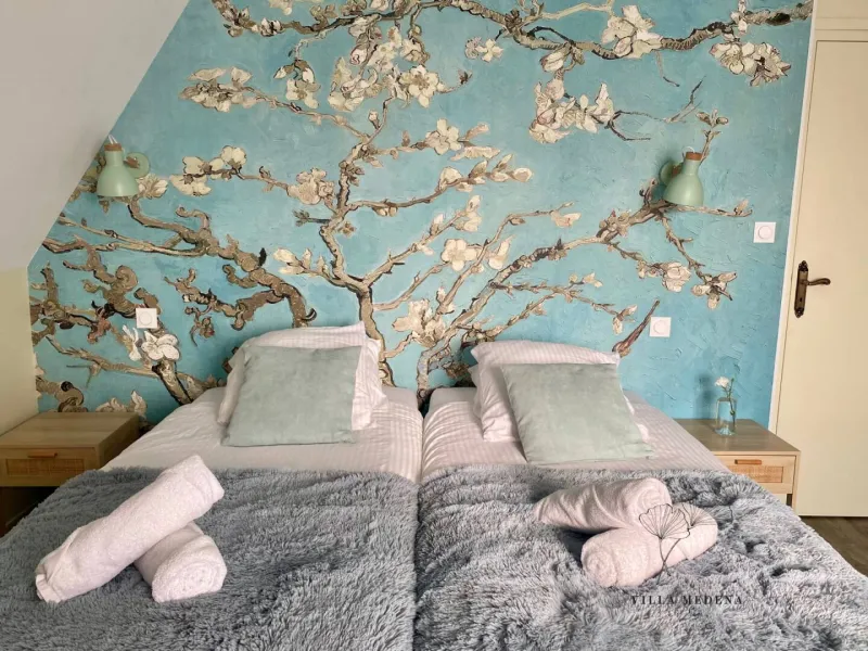 You'll be staying in the "Amandiers" or "Bulles" rooms, each with 2 comfortable 90x200 single beds, and there's also a sofa bed in the living room for two extra people.