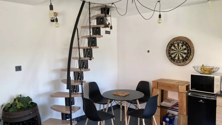 Welcome to Buxy in the southern Côte Chalonnaise, a sublime wine village bordered by its 1er Crus. We offer you our newly renovated house, mostly furnished with handmade furniture around the wine theme. The house is 37m2 (Loi Carrez, 50m² on the ground), includes a terrace and a nice little plot of land with fruit trees. It is a duplex with a large bedroom upstairs. Its openings give onto a superb view of the 1er Crus of Montagny.