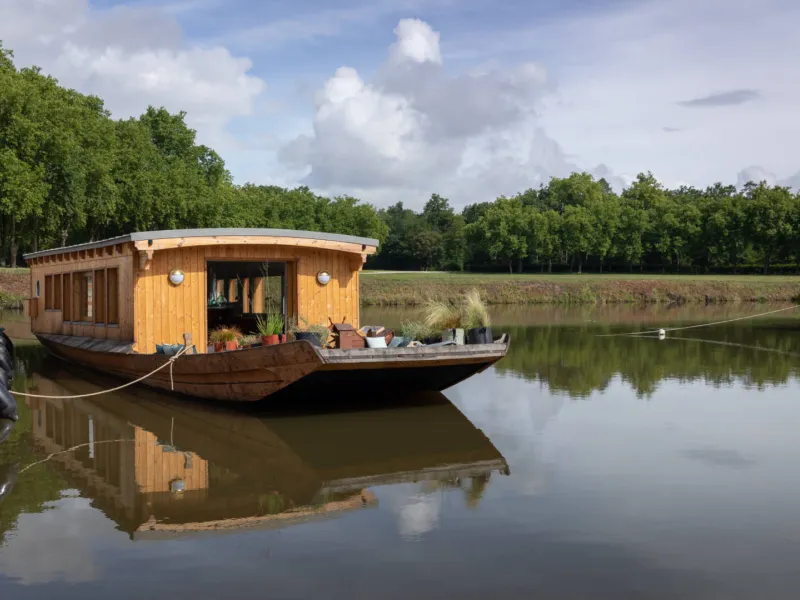 Our private suite floats on the Cosson canal? Discover our atypical room with the Château de Chambord in the background. Book a magical night aboard the Toue du Relais, a traditional flat-bottomed Loire boat, converted into a luxury suite for two.Localisation