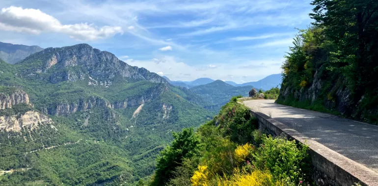 Die Grand Tour des Préalpes d’Azur startet im Hinterland von Grasse und führt durch alpine Kalkplateaus, dichte Wälder und tiefe Täler. Die Radroute verläuft im Mittelgebirge, im Herzen der verborgenen Täler des Regionalen Naturparks Préalpes d’Azur. Diese Tour bietet den Radreisenden ein wahres Farbenspiel: das Azurblau des Himmels, das Olivengrün der Baumkronen, das Weiß und Ocker der Felsen und das Himmelblau der Flüsse. Auf den kurvenreichen Straßen, die teils in die Felsen gehauen sind, eröffnen sich immer wieder atemberaubende Blicke auf die Riviera und die umliegenden Bergmassive. Begleitet wird dieses Radabenteuer von der beruhigenden Symphonie der Natur – dem Zwitschern der Vögel, dem Rauschen der Bäume, dem Plätschern des Wassers – und manchmal auch von dem leisen Huschen einer Eidechse, die bei Ihrer Ankunft rasch ihren sonnigen Platz auf dem Asphalt verlässt.