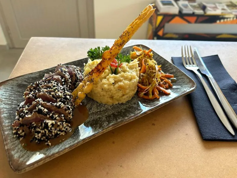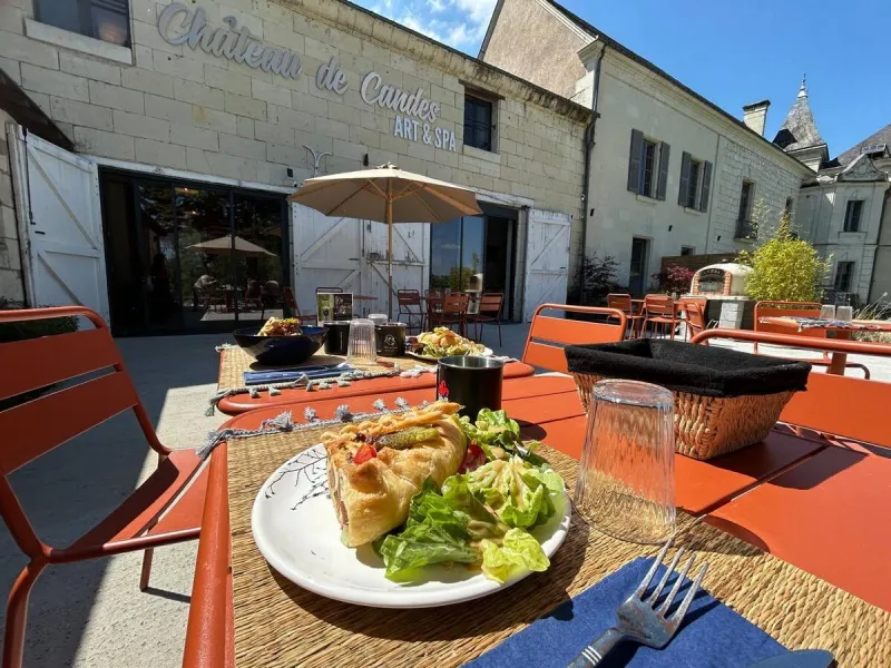 Le Baladin, the P'tit resto at Château de Candes, welcomes you for a delicious, soothing break overlooking the Loire. Take the time to relax, either inside or on the terrace, and enjoy authentic, home-cooked cuisine using local, seasonal produce. Warm and relaxed, the restaurant, decorated with creations by street artists, is open to all, every day, non-stop. Breakfast, brunch or afternoon tea, depending on the time of day. At lunch, you'll enjoy fresh Asian-inspired pastas, generous salads and daily specials and desserts. A selection of local beverages, including soft drinks, beers and wines, is also available. Vegetarian à la carte offerings and Chef's Signature dishes to discover with the seasons. Takeaway service available.Localisation