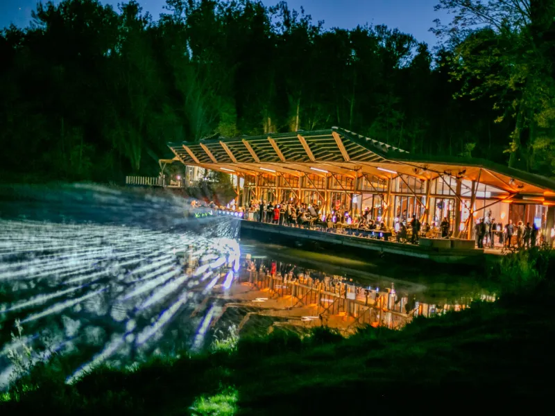 Le restaurant est également un lieu reposant. Une terrasse vous permettra de bénéficier d'un cadre exceptionnel donnant sur le bassin de Chalais traversé par le Tapis Vert offrant en plein cœur du site un cadre paisible.