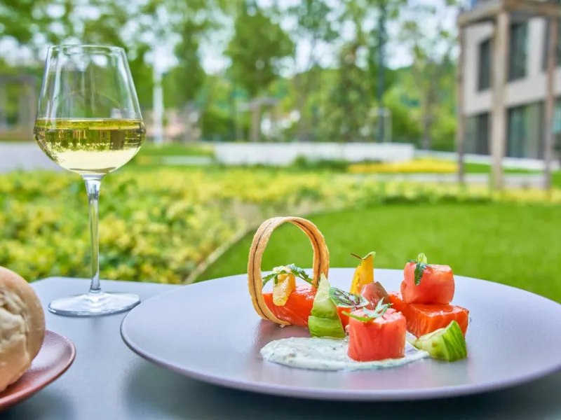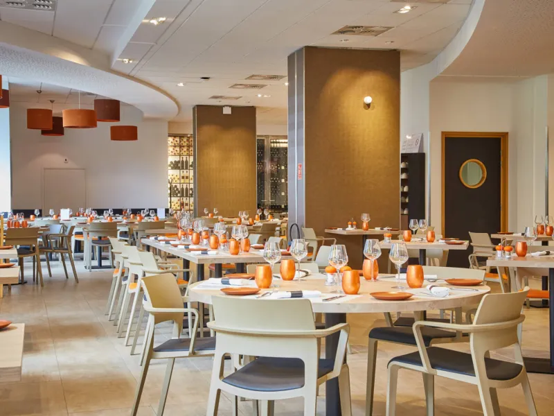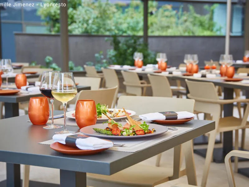 Lunch or dine in the modern and warm interior dining room or on the shaded and cosy exterior terrace with a view of the Saône River in fine weather.