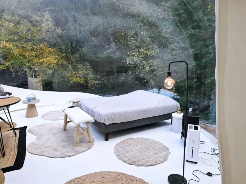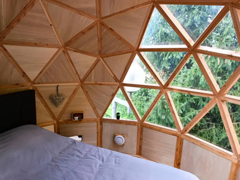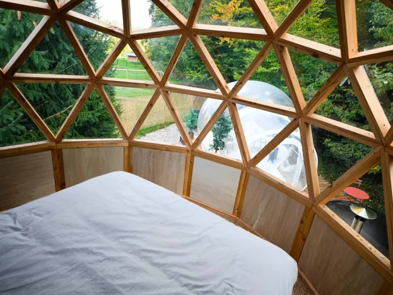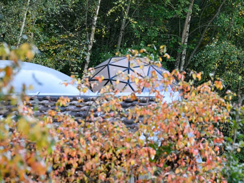 Succumb to the charm of the large Olia dome, an unusual and spacious accommodation designed for 2 to 4 people. A true bubble of serenity on two levels, its transparency plunges you into the heart of nature for a magical experience, between sky and greenery. Relax in your private Nordic bath, enjoy an exclusive terrace and let the surrounding calm lull you into an unforgettable stay.A sanitary chalet with shower and WC is just a few steps away. Breakfast, included in the price, will get your day off to a good start.