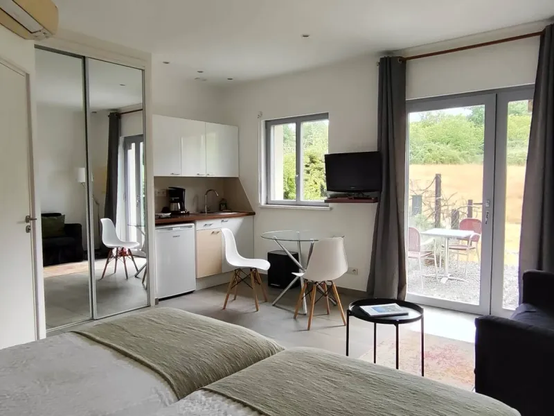 Nestling on a hillside in a twelve-hectare wooded setting just two minutes from the IFCE - Cadre Noir de Saumur in the Loire Valley, the Domaine Equestre welcomes you to one of its 4 accommodation units for 2 people.Studio 3, on the garden level, offers a high level of comfort thanks to reversible air conditioning, advanced thermal and sound insulation and double glazing.